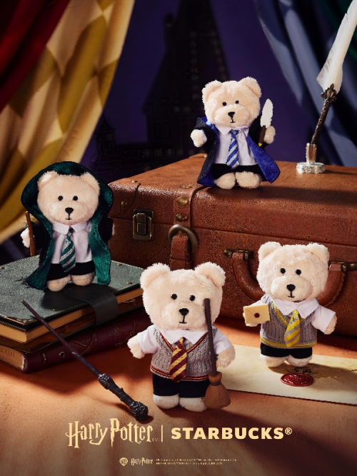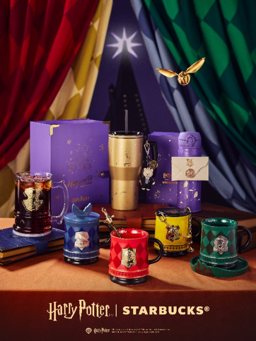 除此之外,星巴克用心创作推出了多款周边,每一个细节都传递着灵感来自哈利·波特世界的魔法惊喜。星杯选取格兰芬多、赫奇帕奇、拉文克劳和斯莱特林这霍格沃茨四大学院,霍格沃茨城堡及猫头鹰海德薇等哈利·波特经典元素,并融入如“魔法”般的设计巧思——四款学院复古铭牌马克杯可遇热变色,显现学院专属的元素图样;霍格沃茨城堡款玻璃杯置于杯垫之上,则能绽放神秘的紫色炫光。星巴克人气IP熊店长也换上四学院服装,手持魔法道具,化身四款星礼包产品。
