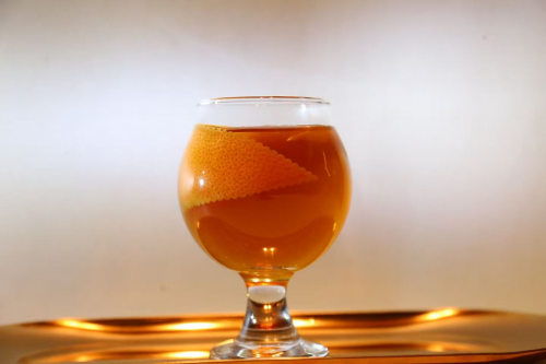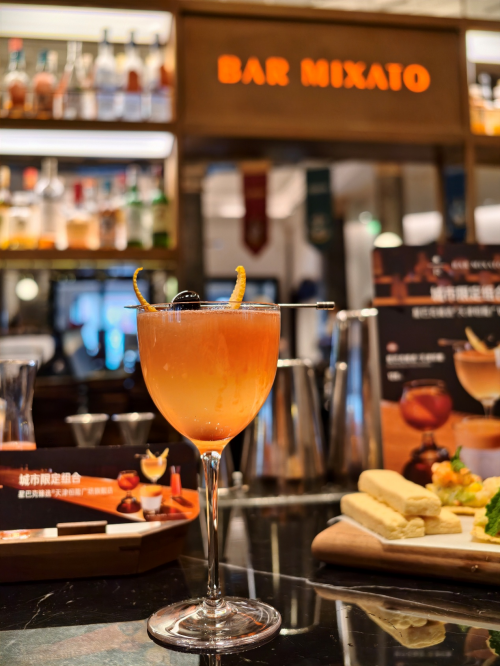 第三杯特调鸡尾酒,以“海河落日”为创意主题,在研发过程中历经30余次风味调试,最终呈现出如夕阳浸染般的暖调色泽,入口甘醇清爽。杯沿点缀着轻舟造型装饰,与海河的视觉印象巧妙呼应。