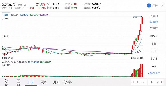顺着这个思路,资金选择了光大证券作为潜伏地,你看,光大是既有银行,券商股价又在低位,拉升毫不费力,简直是炒作的最佳标的。于是在9个交易日内,投机资金就将光大证券从11.04块拉升至21.03块,近乎翻倍。
