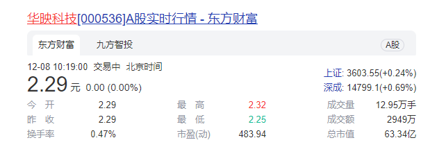 交易行情显示,12月7日,华映科技低开3.66%,开盘价为2.37元/股。开盘后,华映科技股价继续走低,截至当日收盘,华映科技报2.29元/股,跌幅为6.91%,总市值为63.34亿元。